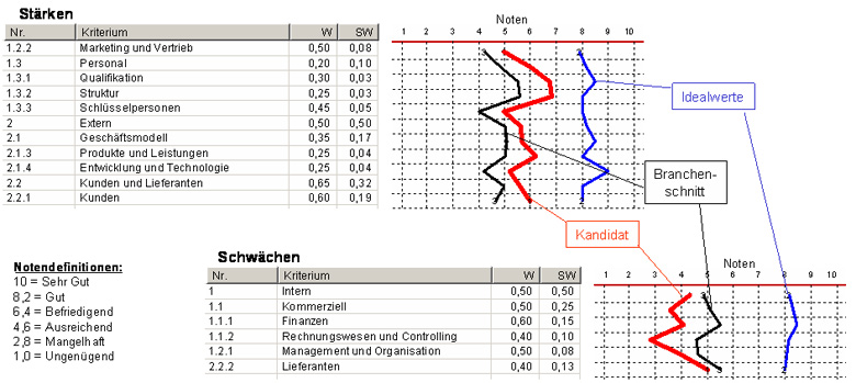 Speziell entwickelte Grafiken erlauben die Bestimmung von Zielpositionen zur Erlangung einer verbesserten Bonität. Dieses sind unternehmerische Entscheidungen, die mit sehr viel Transparenz am Bildschirm getroffen werden. Ein besonderes Merkmal dieses Schrittes ist die Nutzung des Tatbestandes, dass eine schlechte Leistung in einem bestimmten Bereich durch eine gute Leistung in einem anderen Bereich kompensiert werden kann. Dieser erlaubt es, zur Erreichung eines Rating Zielwertes Änderun-gen vornehmlich in den Bereichen vorzunehmen, die leicht umzusetzen sind.