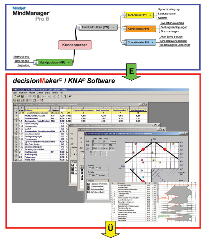 Kriterienstrukturen werden mit Hilfe der MindManager© Software erstellt. Es besteht eine Exportfunktion in die decisionMaker© / KNA© Software.Gewichtungsfaktoren und Noten (bzw. Erfüllungsgrade) werden in der decisionMaker© / KNA© Software erhoben. Eine Reihe von Unterstützungsfunktionen steht zur Verfügung, wie z.B.